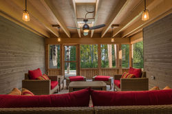 After five years of enjoyment of their studio, our Client requested additions to what we considered a masterpiece! We were able to quadruple the floor area without compromising the aesthetics of the original architecture. A low-ceiling gallery connects the new volumes and original Studio, narrowing as one approaches the private spaces. Organically-placed log columns support a rough-sawn wood beam. The gallery space is illuminated by concealed LED lights that enhance the warmth produced by the three-sided fireplace and heated tile floor. Views across the property extend through the exterior spaces, both open and screened in.